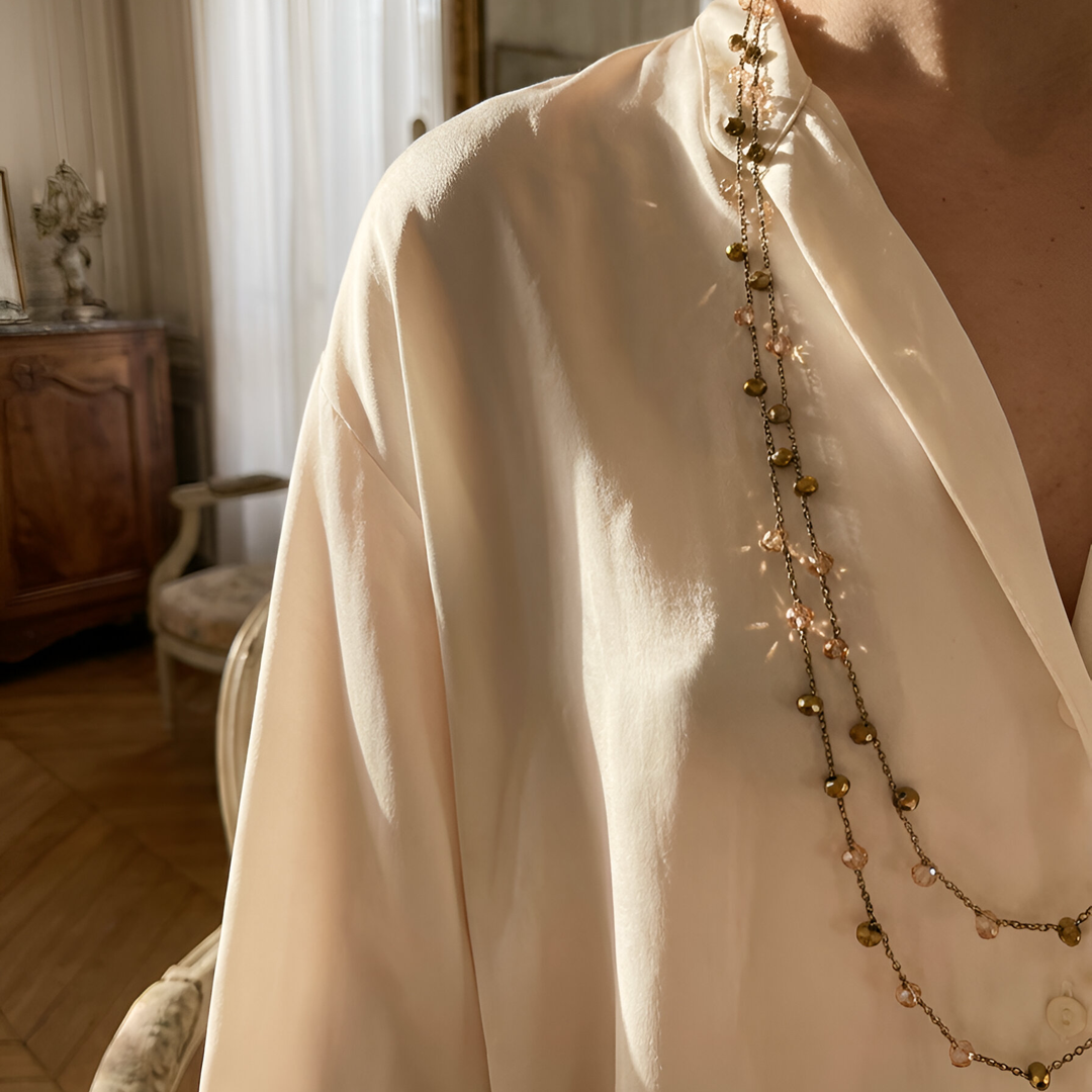 Le pietre in pasta di vetro riflettono la luce in modo naturale, creando sfumature che possono apparire più intense o più luminose a seconda dell’illuminazione. Questo effetto richiamasfumature calde e naturali e rende la collana particolarmente viva quando viene indossata.