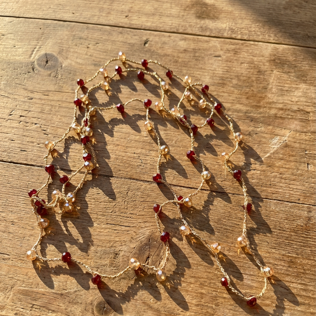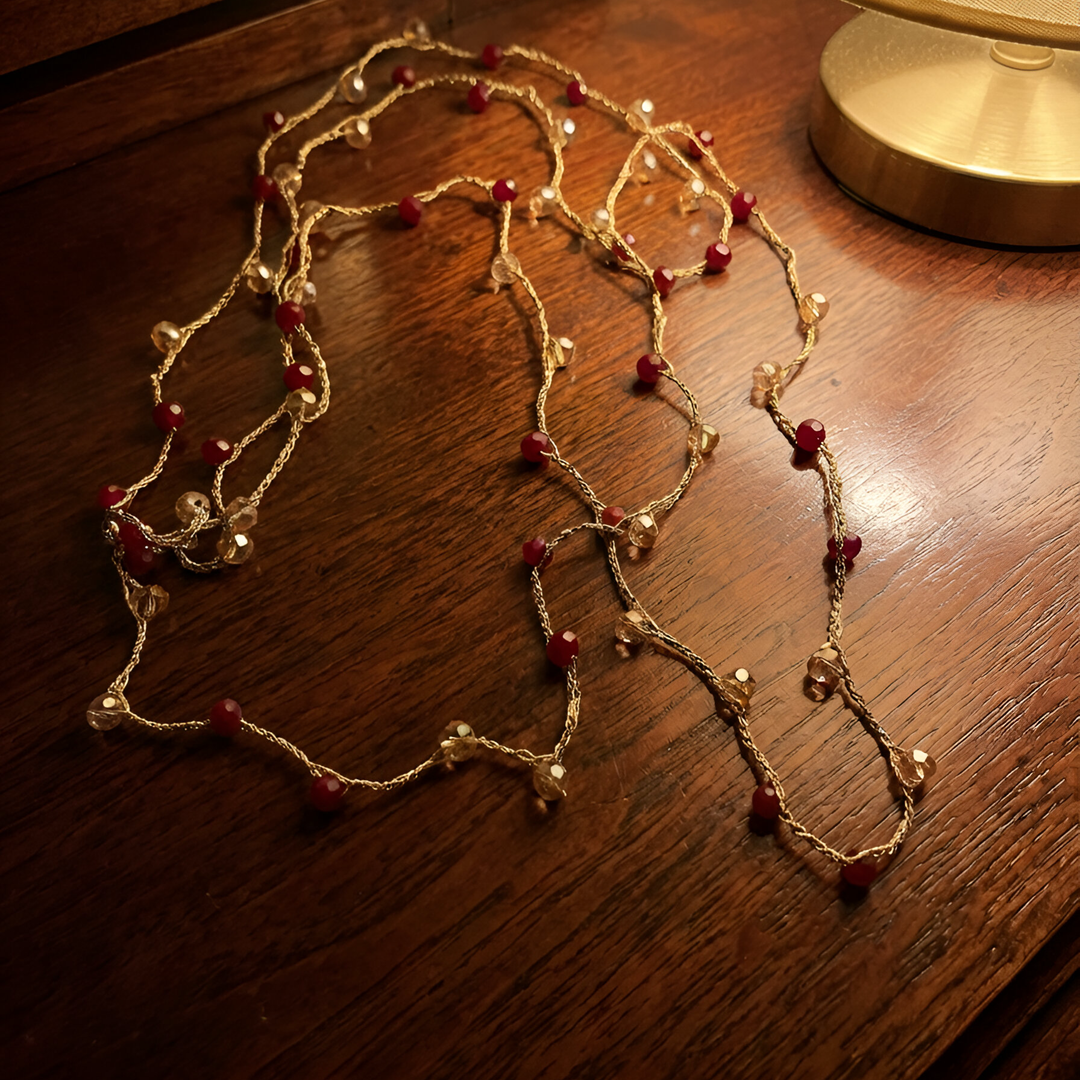 Gioiello artigianale realizzato con catena in seta dorata intrecciata e perle in pasta di vetro rosso e ambra, ispirato ai colori barocchi della città di Lecce. Ogni pezzo è unico, con variazioni leggere nella disposizione delle pietre, per un look elegante, luminoso e minimal. Perfetta da sola o in layering, porta un tocco di luce mediterranea ai tuoi outfit quotidiani.