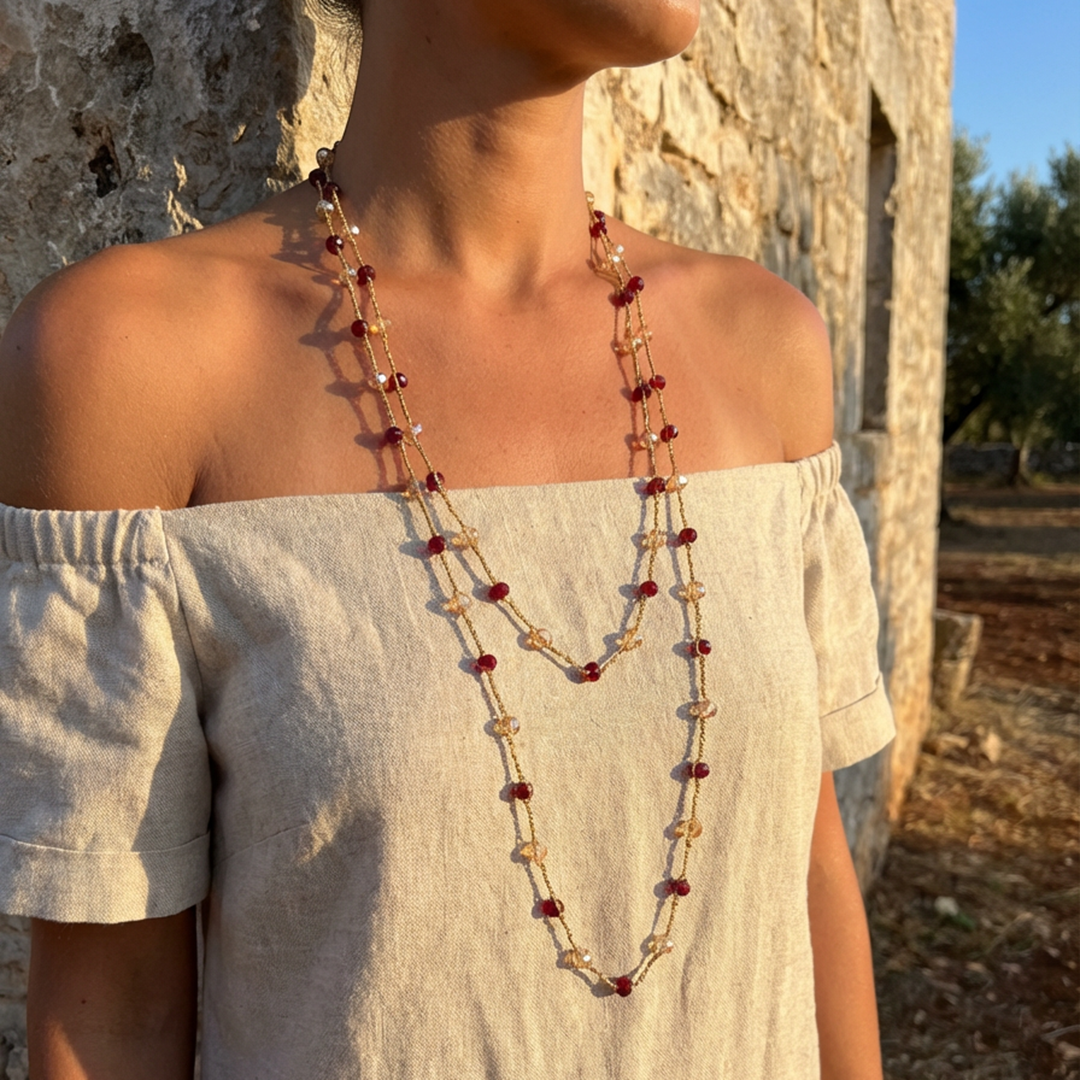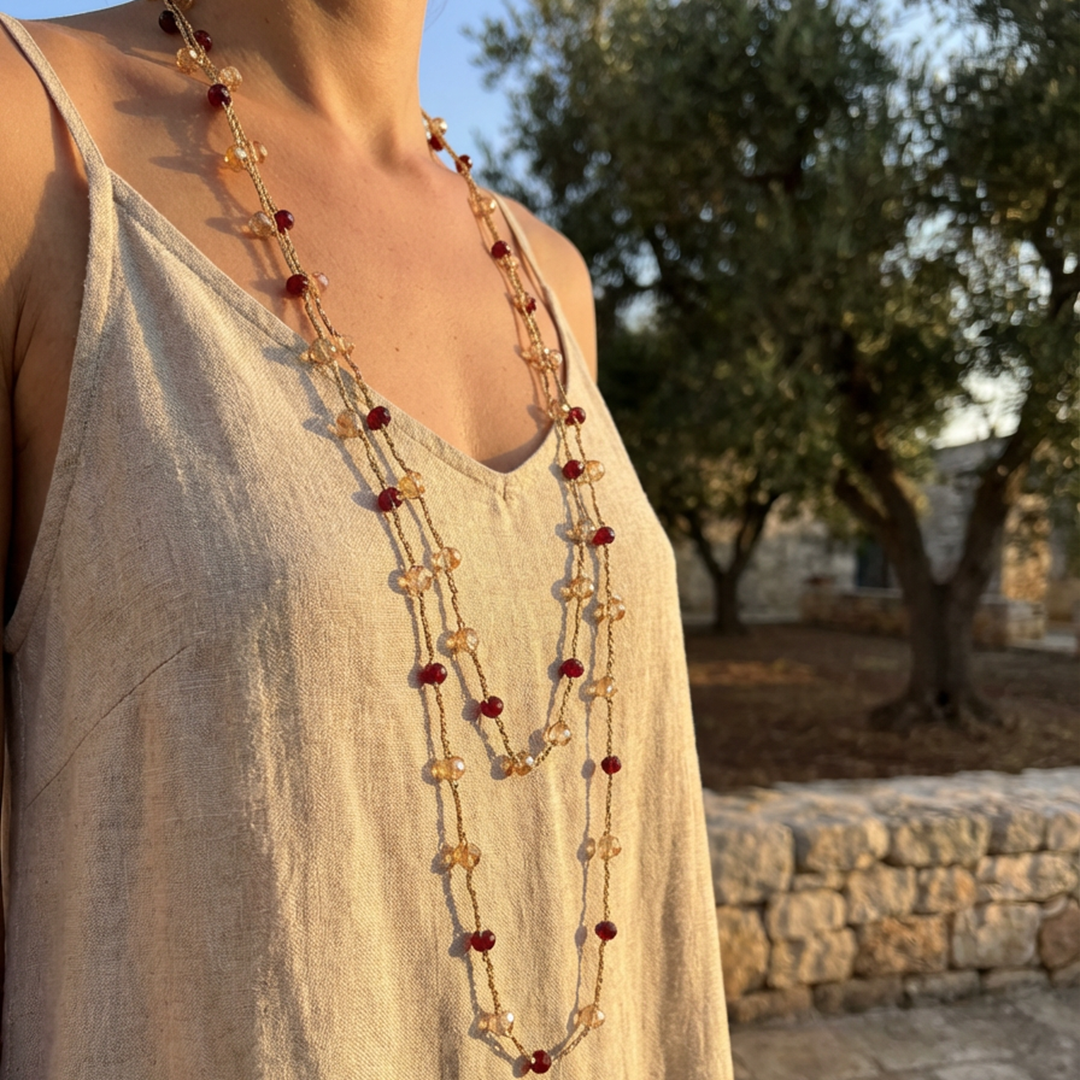 La collana Apulian Collection – Lecce è una collana artigianale caratterizzata da delicate pietre in pasta di vetro nelle tonalità del rosso intenso e dell’ambra dorata, ispirata alla luce calda che avvolge la città di Lecce e alla sua inconfondibile pietra leccese.