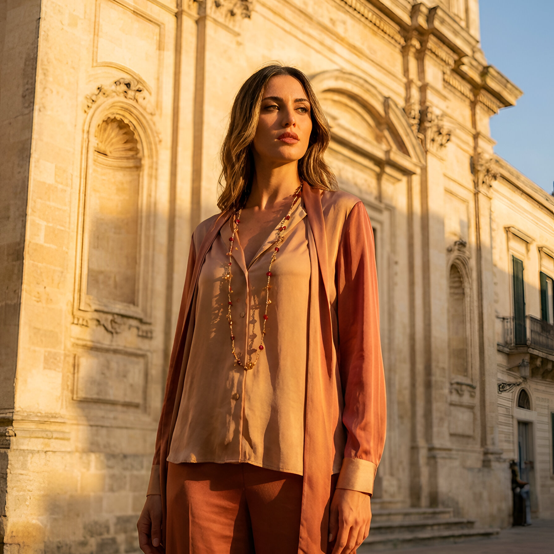 La collana Apulian Collection – Lecce è pensata per essere versatile: può accompagnare con eleganza un look quotidiano elegante, ma anche ideale per completare un outfit serale grazie alle sue tonalità profonde e raffinate.