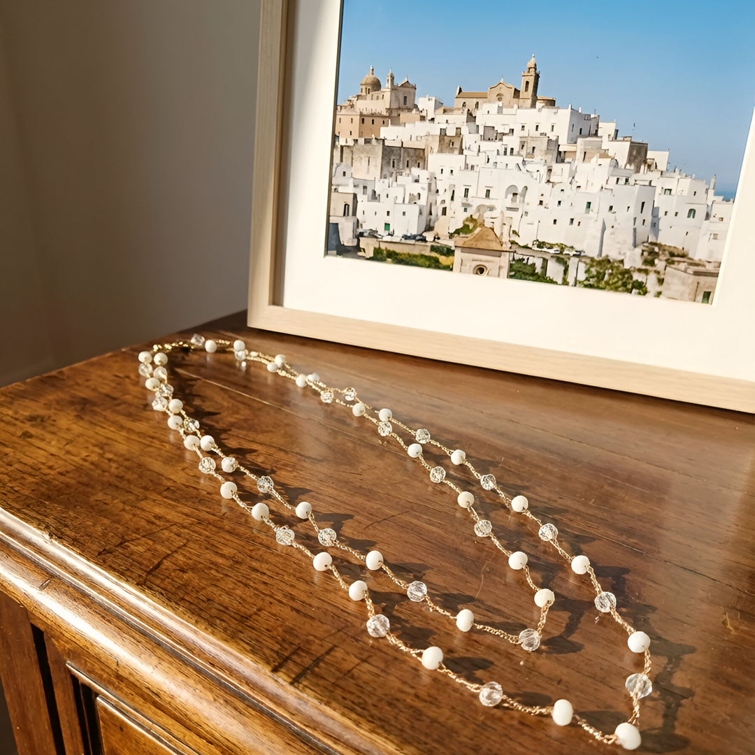 La collana Apulian Collection – Ostuni è una collana artigianale caratterizzata da delicate pietre in pasta di vetro nelle tonalità del bianco e del transparente, , ispirata alla purezza luminosa della città bianca di Ostuni e alla luce intensa che si riflette sulle sue architetture.