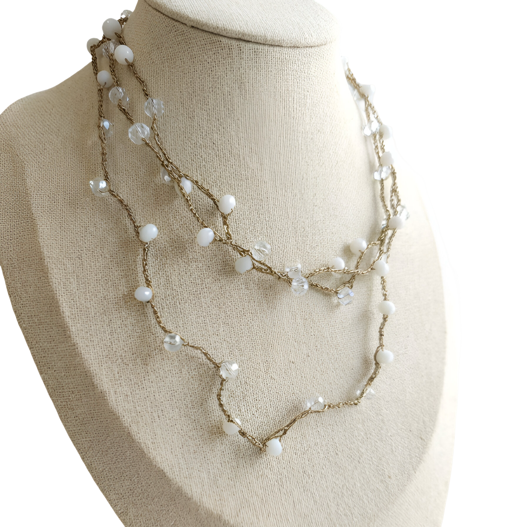 Gioiello artigianale realizzato con catena in seta dorata intrecciata e perle in pasta di vetro bianco e trasparente, ispirato ai colori di Ostuni, la città bianca. Ogni pezzo è unico, con variazioni leggere nella disposizione delle pietre, per un look elegante, luminoso e minimal. Perfetta da sola o in layering, porta un tocco di luce mediterranea ai tuoi outfit quotidiani.