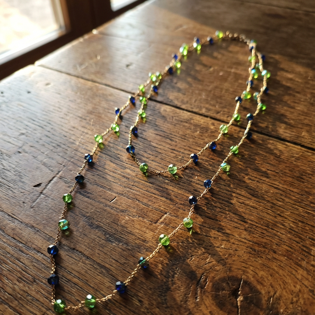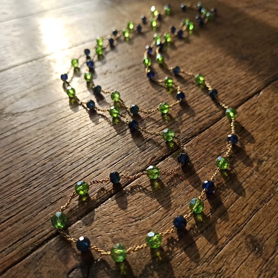 Gioiello artigianale realizzato con catena intrecciata in seta dorata e pietre in pasta di vetro nelle tonalità del verde smeraldo e del blu profondo. Ogni collana è unica, con leggere variazioni nella disposizione delle pietre, che ne esaltano il carattere autentico. Elegante, luminosa e dal design essenziale, è perfetta da indossare da sola o in layering, per aggiungere ai tuoi look quotidiani un tocco di luce intensa ispirata ai colori del mare di Polignano.