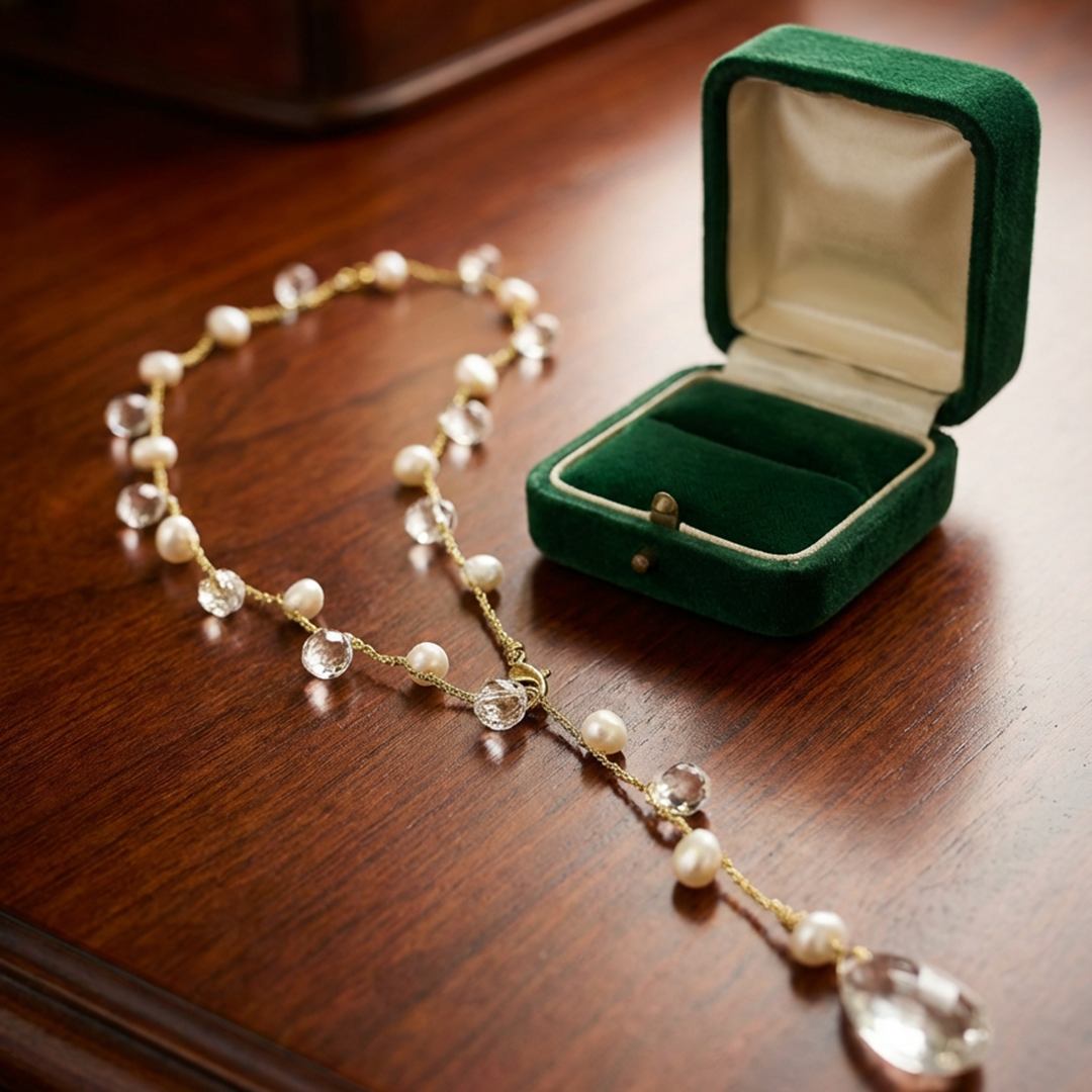 Le sue perle bianche di fiume, intervallate da cristalli di rocca, creano un equilibrio raffinato tra materia e luce, ricordando i giochi di trasparenza dell’acqua e i riflessi dorati del sole sulle superfici chiare della pietra.