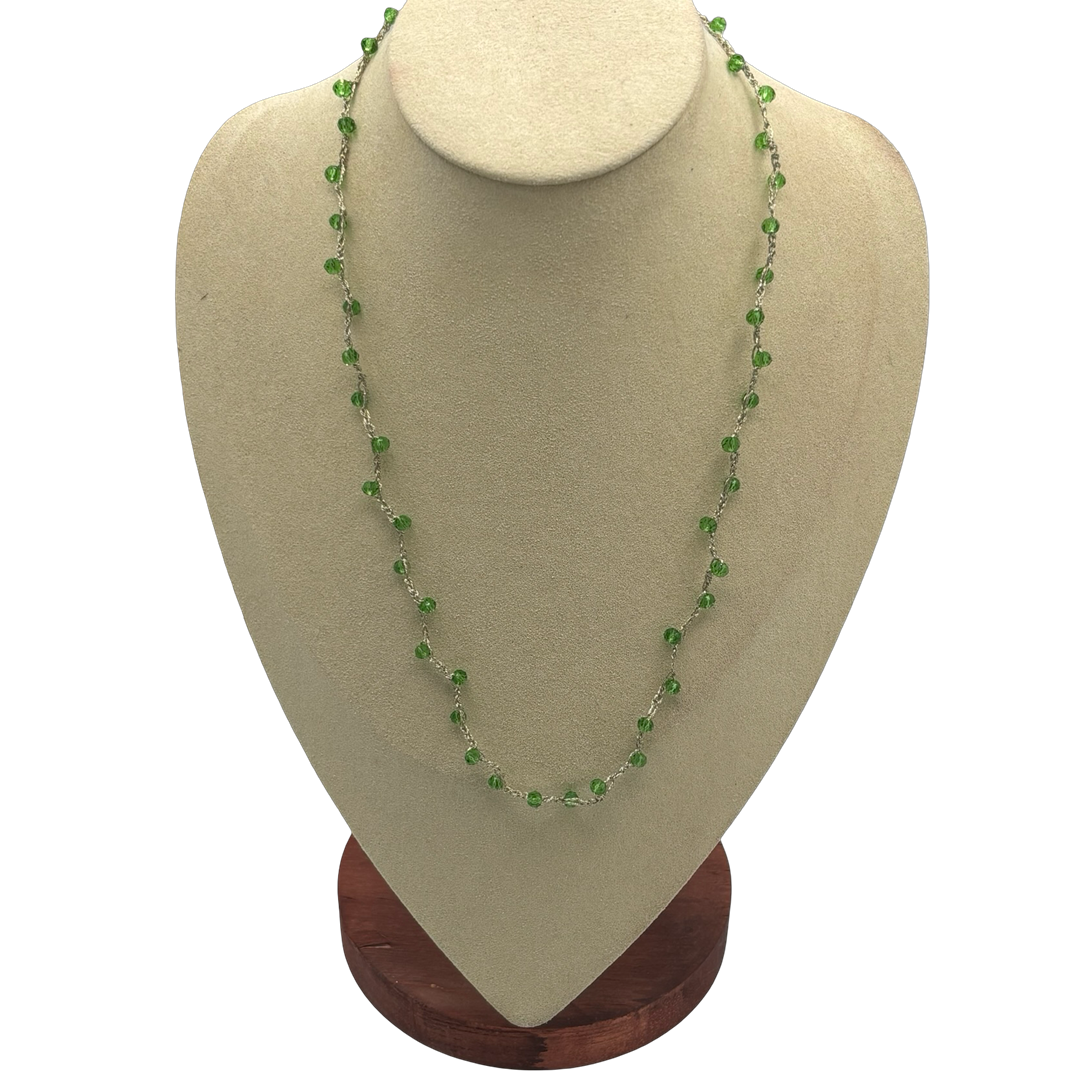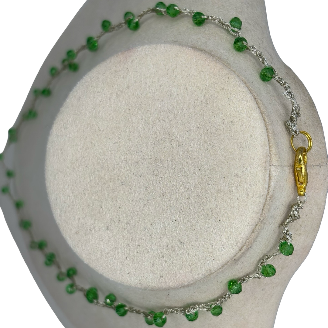 Gioiello artigianale realizzato con catena in seta dorata intrecciata e pietre in pasta di verde smeraldo. Ogni pezzo è unico, con variazioni leggere nella disposizione delle pietre, per un look elegante, luminoso e minimal. Perfetta da sola o in layering, porta un tocco di luce mediterranea ai tuoi outfit quotidiani.