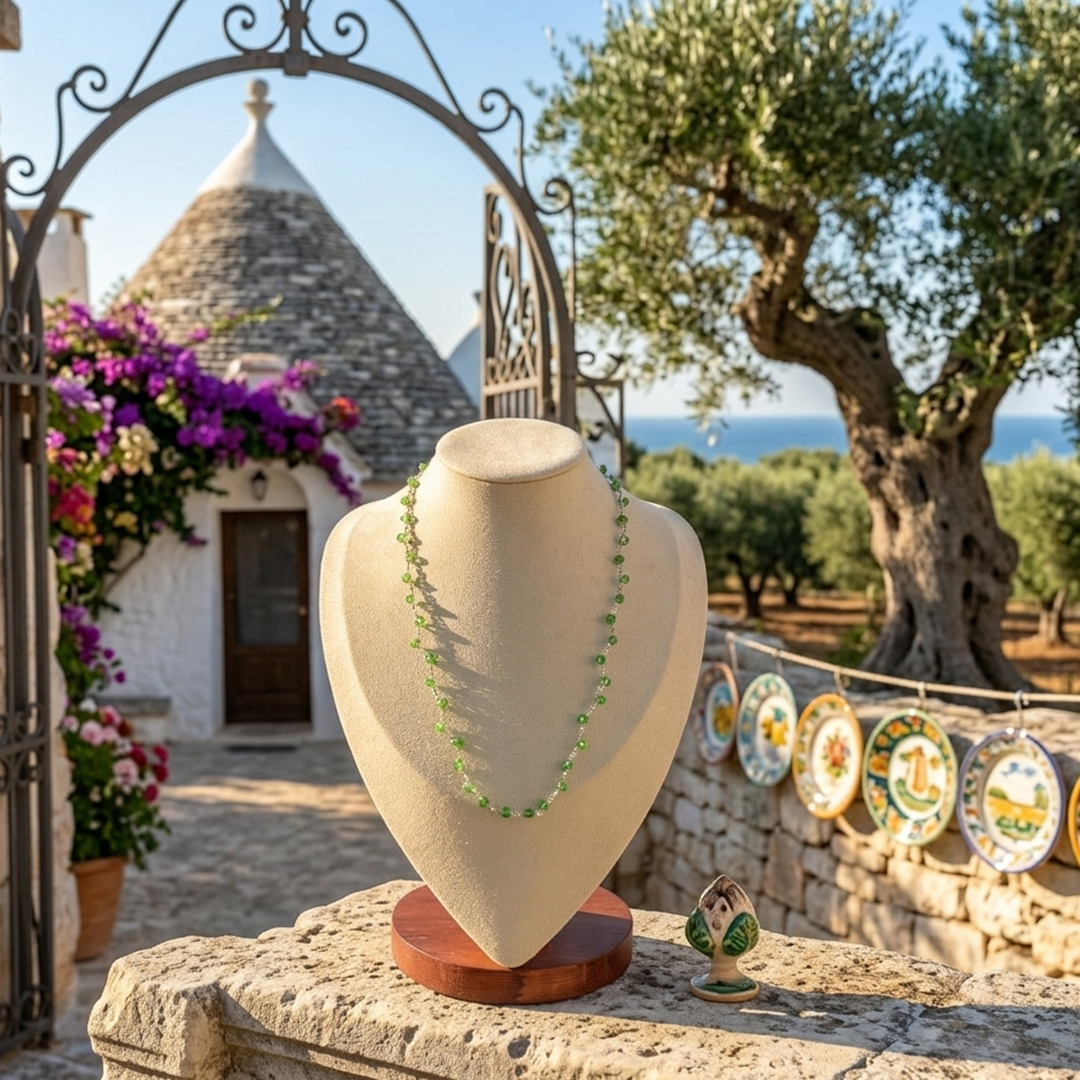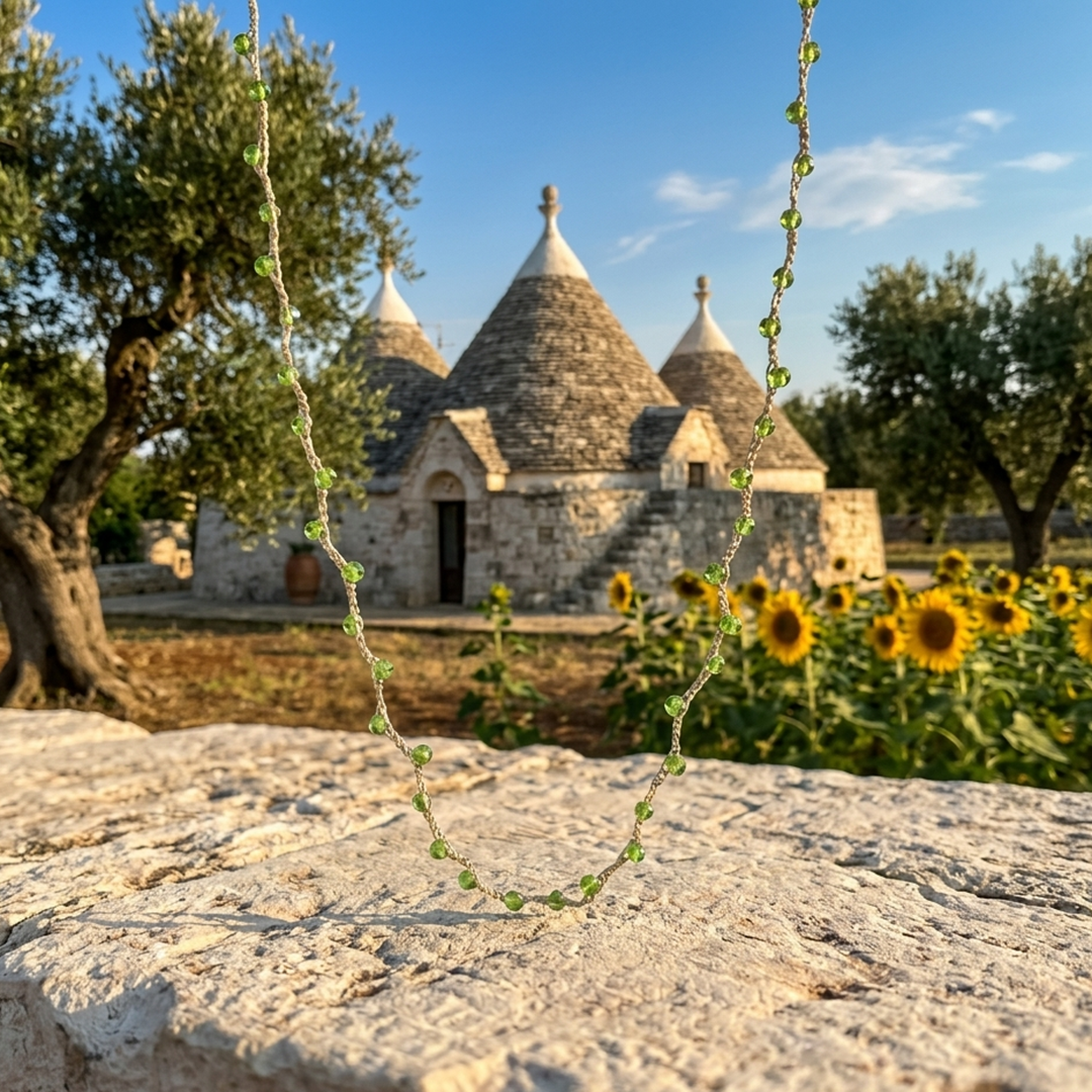 La collana Verde Monochrome – Egnazia Smeralda è una collana artigianale con piccole pietre verde smeraldo, ispirata al colore degli ulivi e dei paesaggi naturali della Puglia.